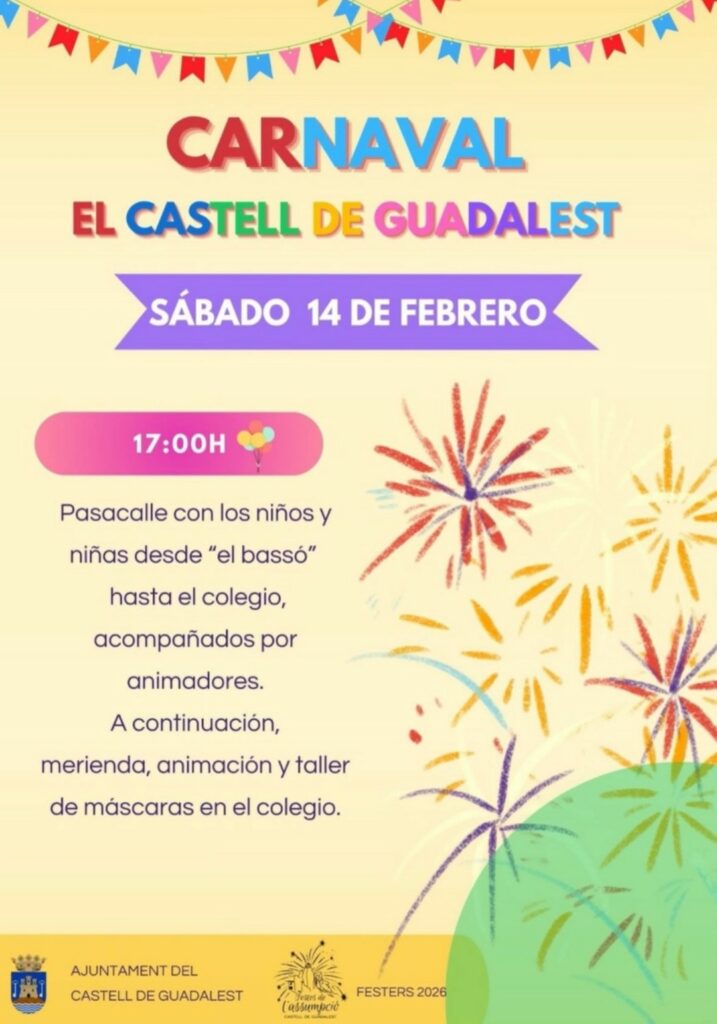 CARNAVAL EL CASTELL DE GUADALEST SÁBADO 14 DE FEBRERO 17:00H 🎭 Pasacalle con los niños y niñas desde "el bassó" hasta el colegio, acompañados por animadores. A continuación, merienda, animación y taller de máscaras en el colegio. AJUNTAMENT DEL CASTELL DE GUADALEST FESTERS 2026