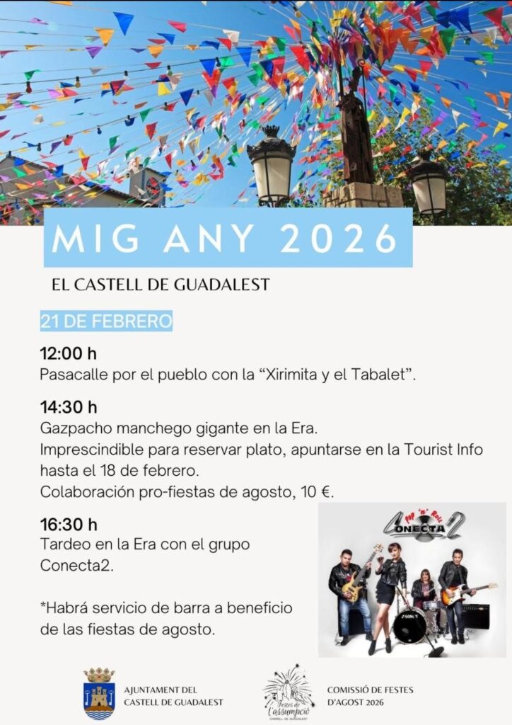 MIG ANY 2026 EL CASTELL DE GUADALEST 21 DE FEBRERO 12:00 h Pasacalle por el pueblo con la "Xirimita y el Tabalet". 14:30 h Gazpacho manchego gigante en la Era. Imprescindible reservar plato, apuntarse en la Tourist Info hasta el 18 de febrero. Colaboración pro-fiestas de agosto, 10 €. 16:30 h Tardeo en la Era [...]